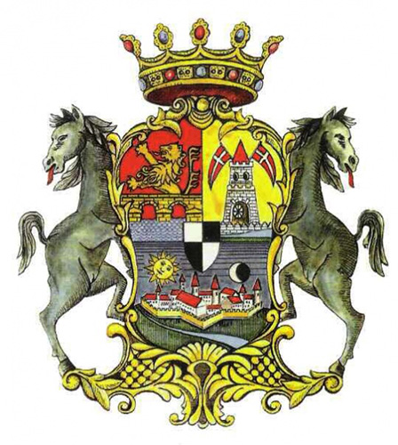 Sus în stânga pe aur un turn de piatră sură, zidit pe pajişte verde având cornişe duble, două ferestre rotunde la etaj, iar în parter o poartă prin care se vede o roată de fier neagră.