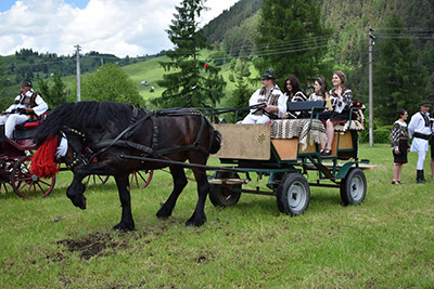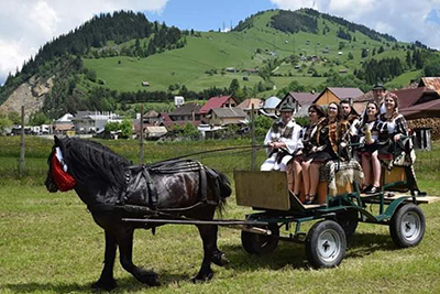 Alaiul de nuntă, format din mai multe căruțe sau trăsuri este precedat de vătăjei pe cai întărnițați. În trăsura din față este mireasa însoțită de nași, apoi urmează trăsura mirelui însoțit de nașe.